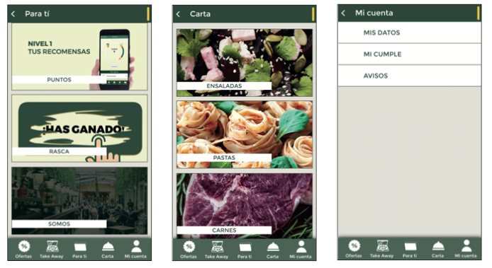 El menú de la app se encuentra en la parte inferior. Verás que aparecen 5 iconos. El menú es fijo, por lo que no importa dónde entres que el menú siempre estará visible y será de rápido acceso.