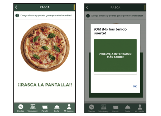 El cliente rascará la pantalla con el dedo. Pueden pasar dos cosas: Que le toque premio o que no. En ambos casos aparecerá un mensaje.